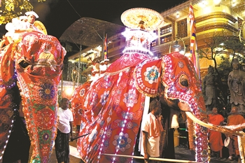 位于科伦坡市中心贝拉湖不远的岗嘎拉马寺是斯里兰卡的重要寺庙之一。每年2月在斯里兰卡佛教节日“纳瓦姆月圆节”期间,该寺都会举行为期两天的月圆节游行。2020年的月圆节游行是2月7日和8日,在游行中,近50头身披各色精致镶边织物的大象穿插在鼓手、舞者、僧人组成的游行队伍中,围绕贝拉湖行进一圈。