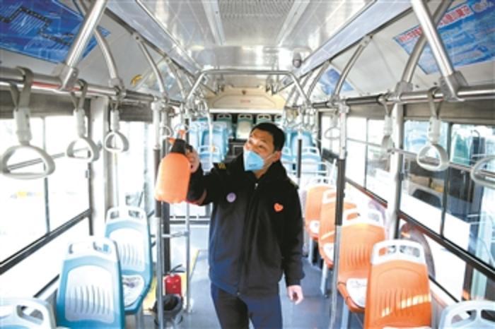 2月10日,在银川市公共交通有限公司北门停车场,工作人员在对公交车进行消毒。