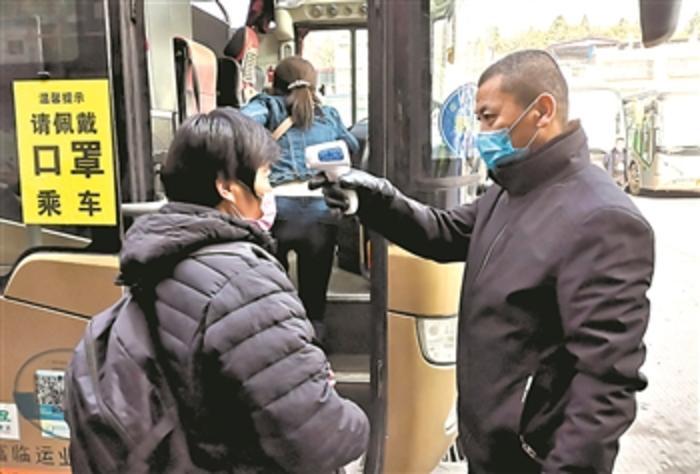 在四川仁寿联营汽车客运站,工作人员在上车之前为乘车农民工测量体温(2月11日摄)。