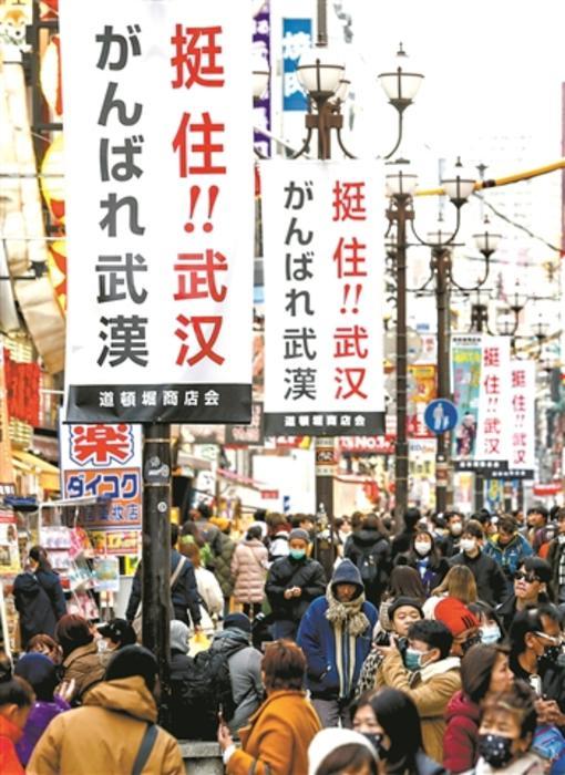 2月10日,在日本大阪,道顿堀商圈的街道上挂着中日双语的“挺住!武汉”标语。 新华社/共同社