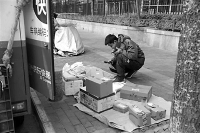 2月12日,一名快递小哥在一处小区外分拣快递。本报记者 王伟伟 摄