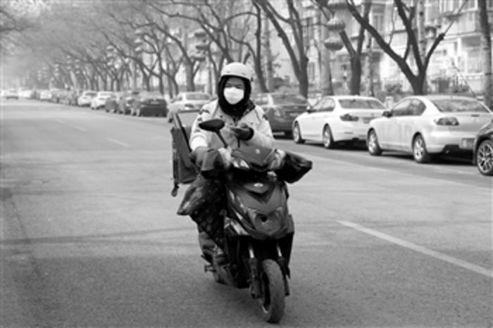2月12日,一名外卖小哥在空荡的马路上送餐。本报记者 王伟伟 摄