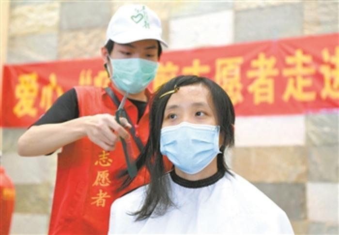 2月13日,志愿者在邕武医院为医师王浜琴剪去长发。