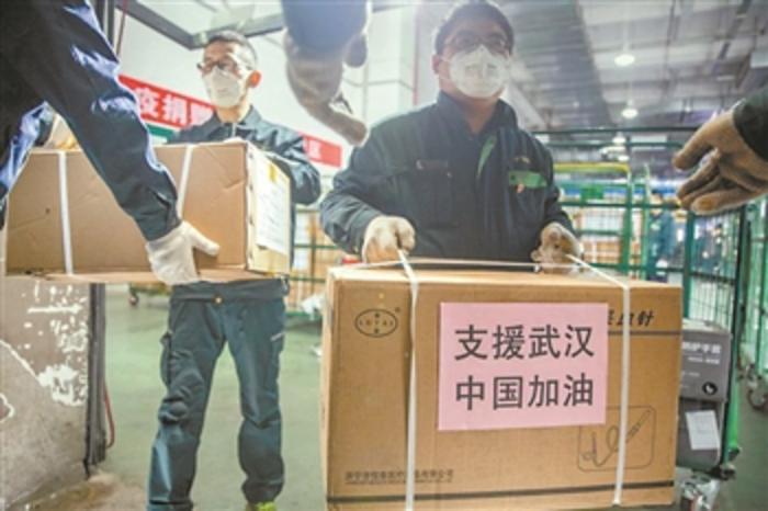 2月6日,北京邮政综合处理中心,工作人员正在打包防疫物资准备发往武汉。王伟伟 摄