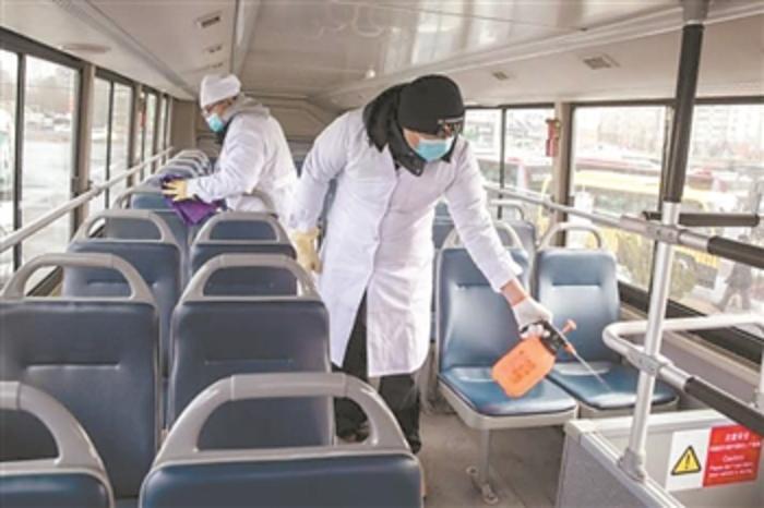 2月2 日北京公交集团工作人员正在为公交车消毒。王伟伟 摄