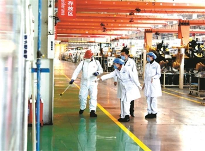 2月17日,派驻雷沃工程机械青岛生产基地的医疗服务队员在指导车间防疫消杀工作。