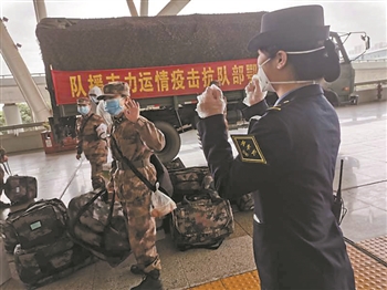 2月13 日,中国铁路郑州局集团公司郑州客运段列车长赵婷婷值乘的G93次列车迎来一群特殊的乘客——解放军某部的一支医疗队,他们将赴武汉抗击疫情。王妮 摄