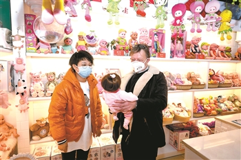 2月18日,来自瑞典的客商佩吉(右)在义乌国际商贸城的一家婴儿玩偶商铺选购。