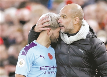 曼城队主教练瓜迪奥拉(右)和队员阿奎罗。