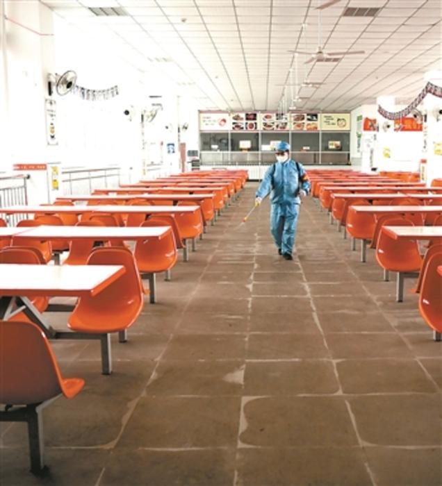 2月19日,在位于重庆市北碚区的重庆力帆乘用车公司,防疫人员在职工食堂内消毒作业,为第二天的复工做准备。