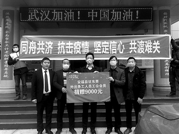 近日,江西安福县驻东莞外出农民工工会会员捐款9000元,用于支持武汉疫情防控工作。尽管不少务工人员因为疫情防控尚未回到工作岗位,但在困难面前,他们都表示希望尽自己的一份力量,用实际行动支援武汉。