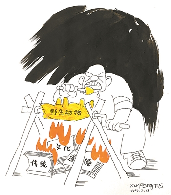 此间,也有一些漫画家和作者,对疫情出现的原因,对病毒的来源等问题进行了深度思考。著名漫画家徐鹏飞先生的漫画《不是嘴馋是脑“残”》,就是一幅这样的蕴含深思并极富讽刺精神的佳作。