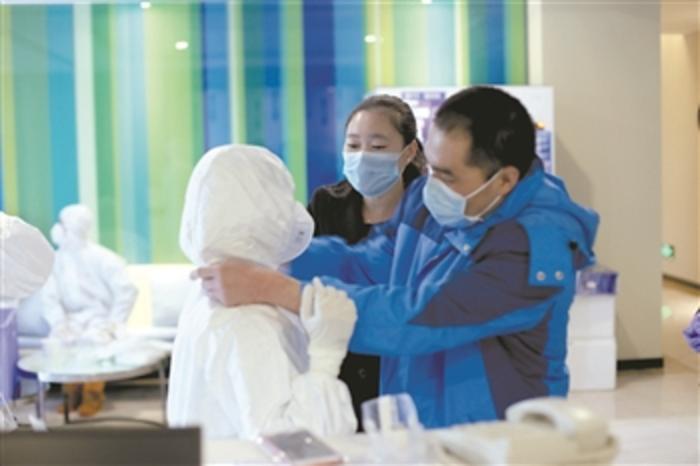 图为酒店工作人员手把手检查防护服穿戴是否符合规范。 黄晨灿 摄