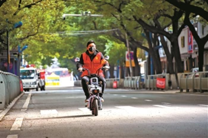 书院社区志愿者梁尚带着代购的药品骑车为居民送药(2月23日摄)。