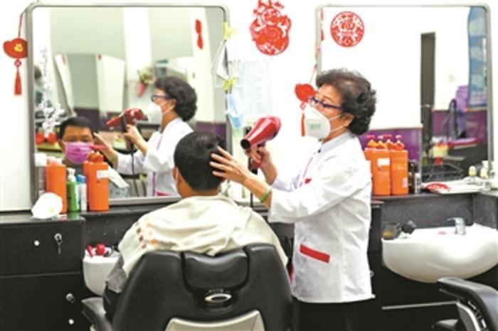 2月24日,北京四联美发店(东四店)员工为取号预约的顾客剪发。