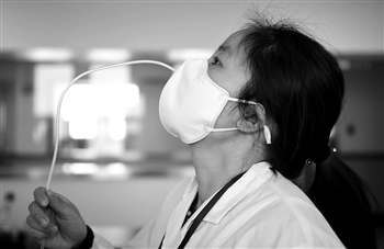 在西安一家医用防护产品实验室,检验员对防护口罩做密合性实验。新华社记者 李一博 摄