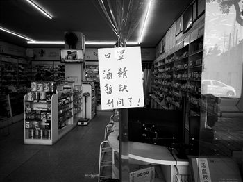 一家药房门口挂着口罩酒精已售完的通知。 本报记者 罗筱晓 摄