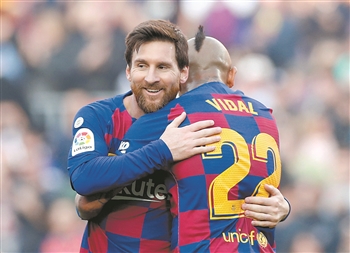 2月22日,巴塞罗那队球员梅西(左)在完成帽子戏法后和队友比达尔庆祝。新华社/路透