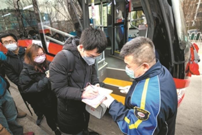 2月27日上午,“天通北苑三区南门——后厂村路”线路的公交司机正为乘客进行体温监测和登记。