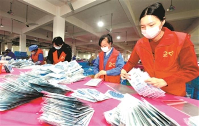 2月27日,浙江省台州市路桥区横街镇由党团员组成的“红马甲”帮扶团,在浙江文武彩印公司当“临时包装工”。当日,该镇组织数支“红马甲”帮扶团分赴企业、农业种植大户,帮助他们搬运物资、包装产品、货物清点,缓解企业人手紧缺的燃眉之急。
