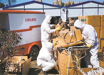 来火神山的路上,傅庆伍一腔热血,信心满满,觉得一身力气再累也不怕。没想到,投入工作第一天就被密闭的防护服来了一个下马威。“最近武汉降温,大家都穿得很厚。我提着垃圾上车,套袋,再给垃圾桶表面擦拭,消毒。一套动作下来,背上就开始冒汗。30多桶清运完,我就感觉自己像一个移动桑拿房。”