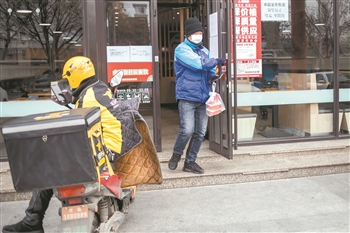 外卖小哥正在一餐馆门口接单配送。本报记者 王伟伟 摄