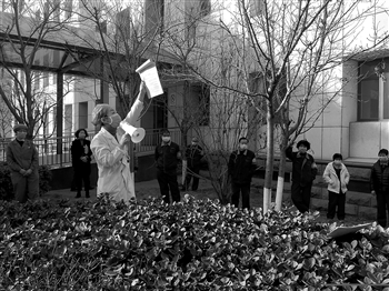 图为该院爱卫办负责人手拿扩音器讲解疫情防控相关注意事项。