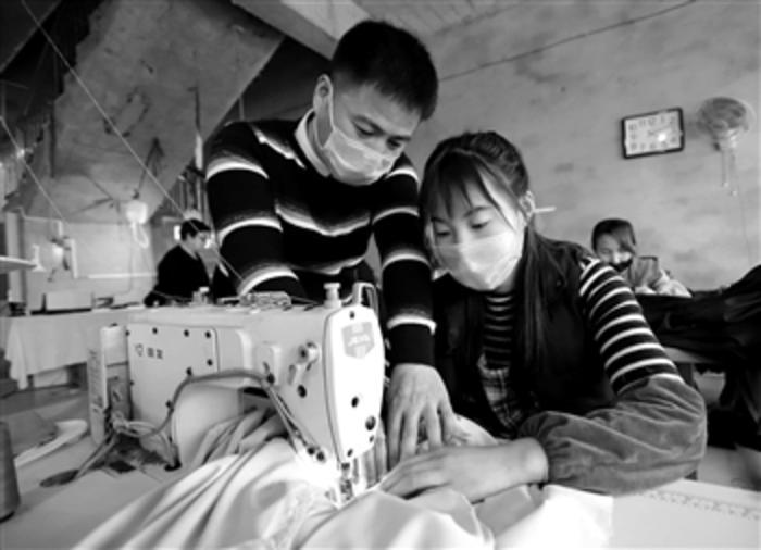 2月25日,在河北省临西县一家衣服加工微工厂,技术员在指导工人缝制衣服。日前,在做好疫情防控工作的同时,河北省邢台市临西县130多家“扶贫微工厂”陆续迎来复产季。