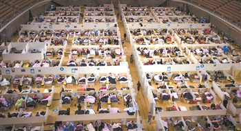 武汉洪山体育馆方舱医院安置着800张床位,因封城而消弥的城市烟火气正逐步弥漫在方舱的每个角落。