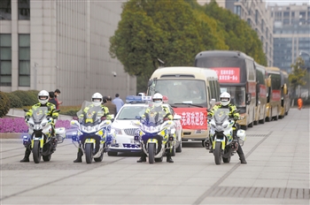 2月26日,载着河北邯郸籍复工工人的包机降落在南京禄口机场,这是新冠疫情发生后安徽省首架企业复工包机,工人乘坐芜湖市安排的专用包车,在交警的护送下前往企业。图为警用摩托车在为复工包车引领带道。