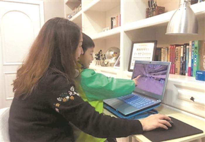一位母亲正陪伴孩子在电脑上体验“云旅游”重庆自然博物馆。兰鹏 摄