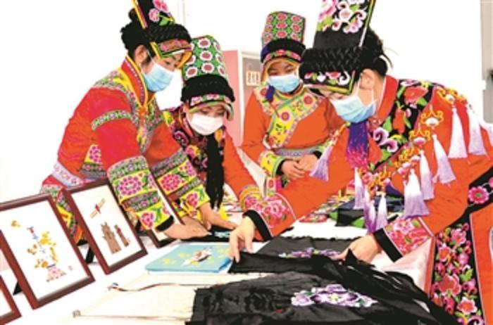 3月1日,陕西省汉中市宁强县的绣娘正在为客商包装羌绣产品。近日,在做好疫情防控的同时,宁强县羌州绣娘文化公司正式有序复工复产,来自各地的绣娘忙着为客商赶制羌绣绣品。被列入陕西非物质文化遗产名录的宁强羌绣是宁强的文化名片和贫困绣娘增收致富的金钥匙,带动留守妇女灵活就业1000余人,300余户贫困户成功脱贫摘帽。 吴天文 摄/人民图片