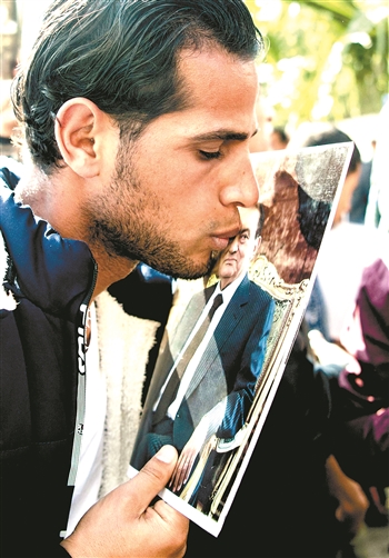 在埃及首都开罗,一名男子亲吻埃及前总统穆巴拉克的照片。