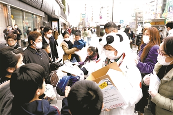 2月29日,在日本东京池袋站前,由在日华侨华人发起的志愿者团体“口罩熊猫行动小组”的志愿者们(右侧)向当地民众发放口罩。 新华社记者 杜潇逸 摄