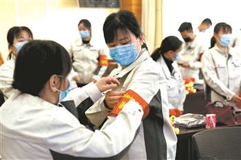 ② “共享员工”们试穿新岗位的工作服。