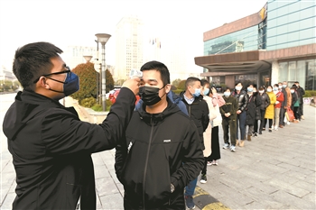 ① “共享员工”们排队测量体温,准备统一乘车前往合肥海尔工业园。