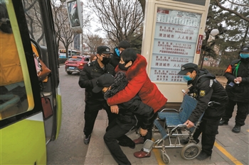 17:51 818路公交车北京始发站郎家园站,乘务管理员帮助一位残疾乘客上车(2月27日摄)。