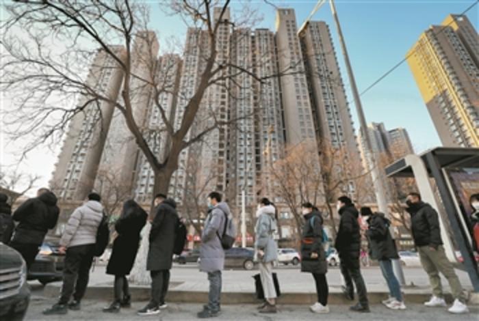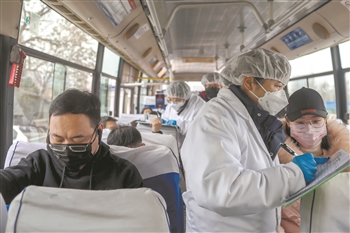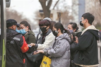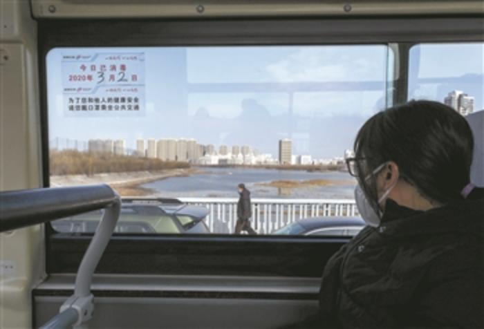 早晨6时40分,天刚蒙蒙亮,抵达北京CBD的车辆准备返回燕郊。整个城市在早春的寒意中还未苏醒,20分钟只上来了6位乘客。林桂丽拉着睡眼朦胧的儿子准备上车,乘务管理员给孩子测体温时,怎么也不显示,脑门不行测手腕,手腕不行测脖子,乘务管理员边测边安慰他们:“你们在外边待时间长了,天气冷,不好测,别着急。”林桂丽刚刚坐火车从内蒙古赤峰回到北京。在火车上,她按要求用手机在“京心相助”(北京疫情跟踪数据报送服务系统)小程序上,对自己的行程和健康状况等个人信息进行了填报。她在北京CBD一公司做财务工作,家就在818路燕郊总站旁边,平时上下班,坐公交是她的首选。