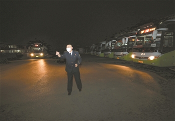 领口罩、量体温、班前测酒、表格签字、班前宣誓,按规定执行完出车前工作流程后,他拎起自己的大茶杯,穿过整齐排放的一排公交车,走到自己的车辆前,借着手机的手电筒,进行车辆轮胎、机油、燃油等16项出车例检。热车过程中,负责消毒的工作人员上车进行清洁、消毒。