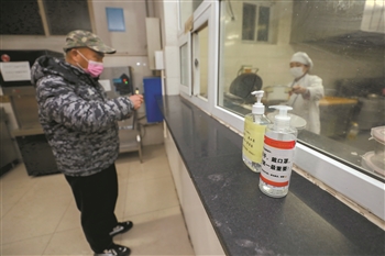 19:17 818路总站食堂,工作人员在打饭,疫情期间,他们采取分时分散的就餐方式(2月27日摄)。