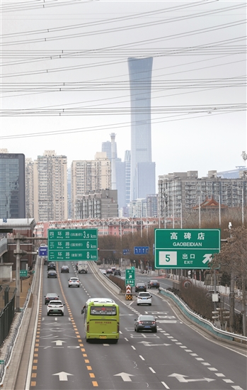 2月27日中午,818路公交行驶在通畅的京通高速路上,远方的大楼是北京地标建筑——中国尊,818路终点站就在中国尊附近。