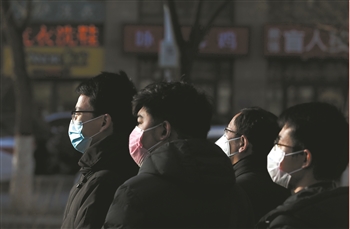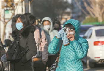 3月2日上午,燕郊一公交站前,一位全副武装的乘客擦拭起雾的护目镜。