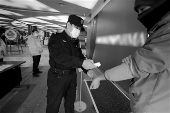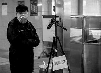 3月1日.北京一百货商场的保安正在给顾客测体温。