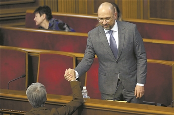3月4日,在乌克兰首都基辅,乌克兰新总理杰尼斯·什米加尔接受祝贺。 新华社发(谢尔盖·斯塔拉斯坚科摄)