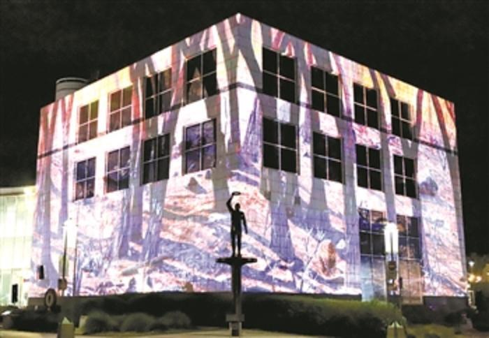 3月6日,在澳大利亚首都堪培拉,灯光节上投影在建筑物表面的影片讲述植物和动物怎样从林火灾难中恢复的故事。 一年一度的堪培拉灯光秀在今年2月28日至3月15日间举行。新华社发(刘畅畅摄)