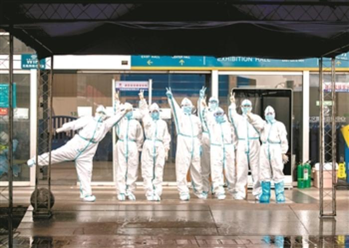 图为3月9日,最后一批结束工作后从江汉方舱医院走出的河南医疗队队员在出舱后合影。