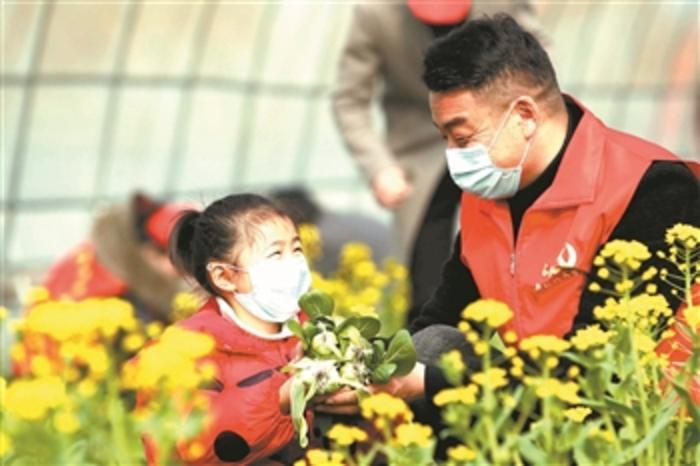 3月7日,江苏泗洪县双沟镇新时代文明实践所组织志愿者带着留守儿童在大棚里采摘蔬菜,体验劳动和收获乐趣。