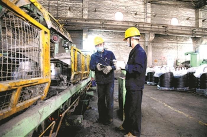 图为该公司骨干技术员在生产车间指导工人生产钢绳。