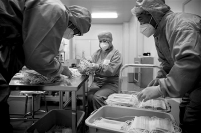 3月4日,位于北京延庆区的北京纳通口罩生产车间,工人们正在生产口罩。为保障中游熔喷布价格稳定和下游口罩产品供应,中石化决定打通产业链,全面介入熔喷料、熔喷布和口罩生产。中石化协助北京纳通在京布设15条口罩生产线,产能100万片/天。截至3月9日,10条已开始投产,相关口罩产品已在北京市场销售。