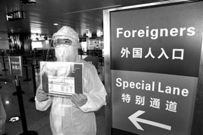 3月5日,青岛流亭国际机场,一名边检工作人员在提示外国旅客填写《外国人入境卡》。为严防疫情输入风险,山东省青岛市在机场等入境口岸加强了防控措施、风险评估和口岸检疫。新华社记者 李紫恒 摄